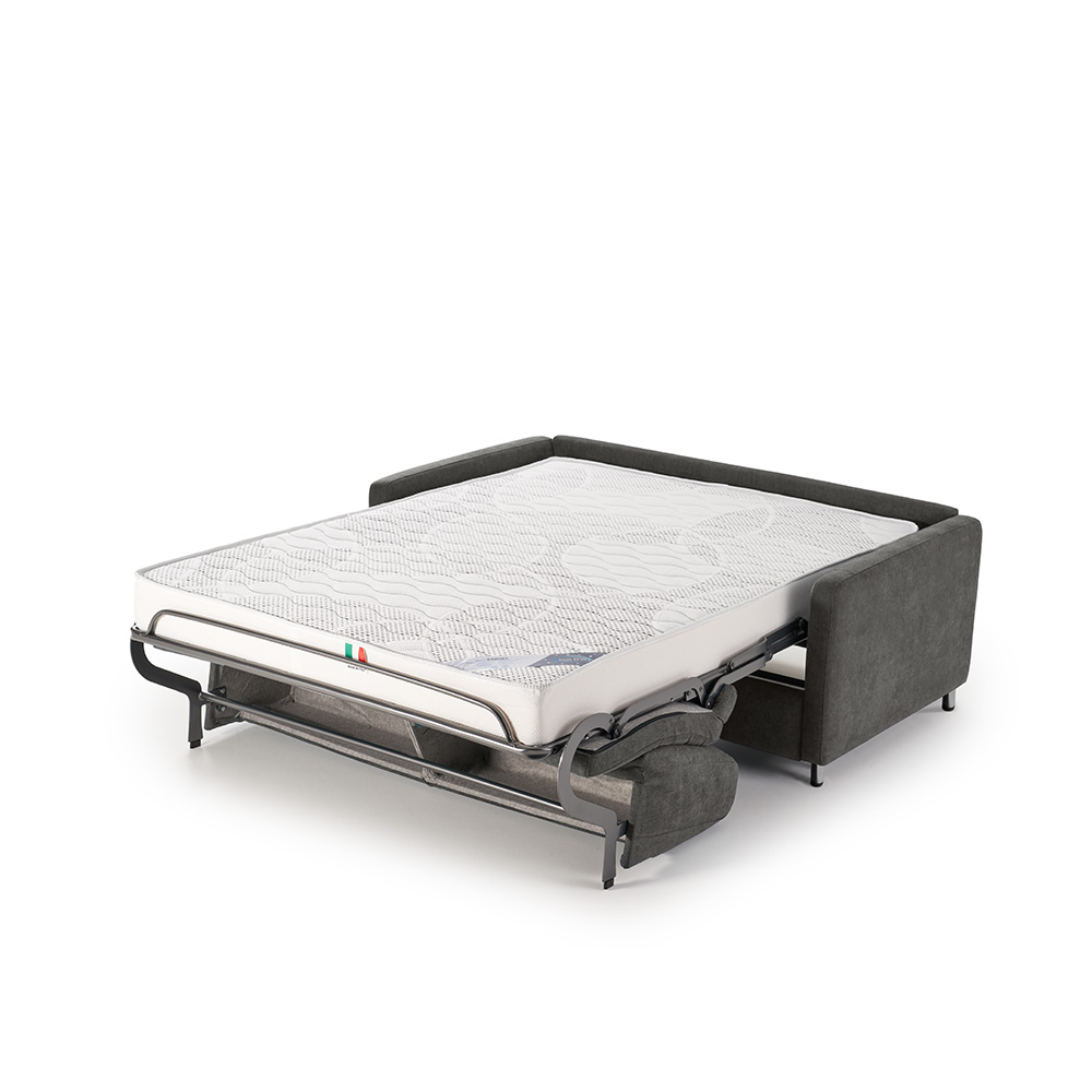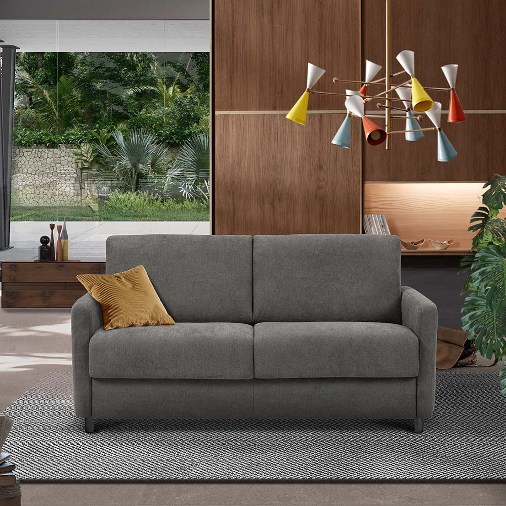 Le Canapé Lit Caro ne lésine pas sur la qualité de construction. Les éléments en bois sont réalisés à partir de panneaux respectueux de l'environnement, répondant aux normes écologiques les plus strictes. La mécanique Otello Big permet une transformation fluide du canapé en lit, en une seule rotation, sans avoir à retirer les coussins d'assise et de dossier.